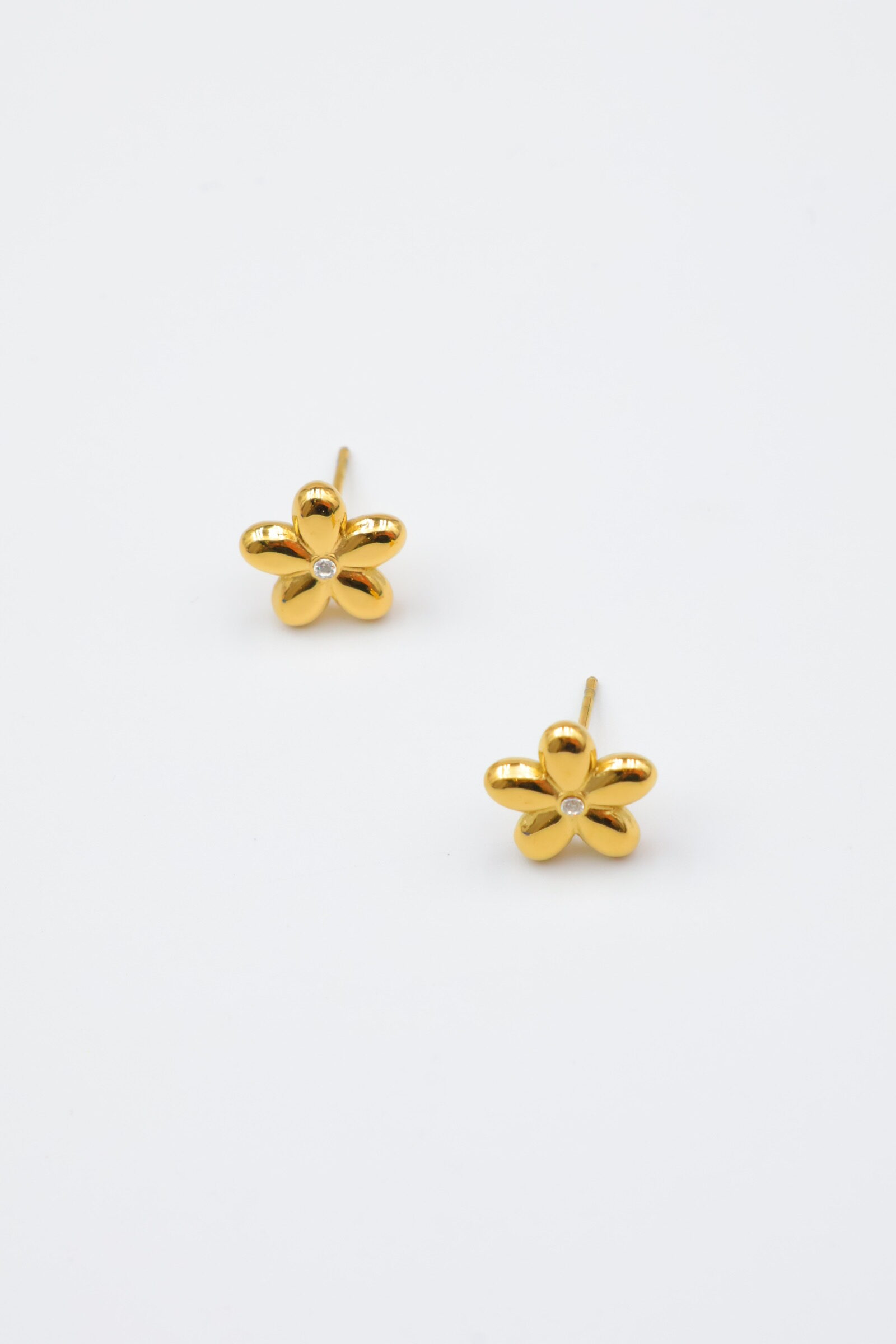 Délicates boucles d’oreilles puces en forme de fleur à 5 pétales, finition dorée brillante.