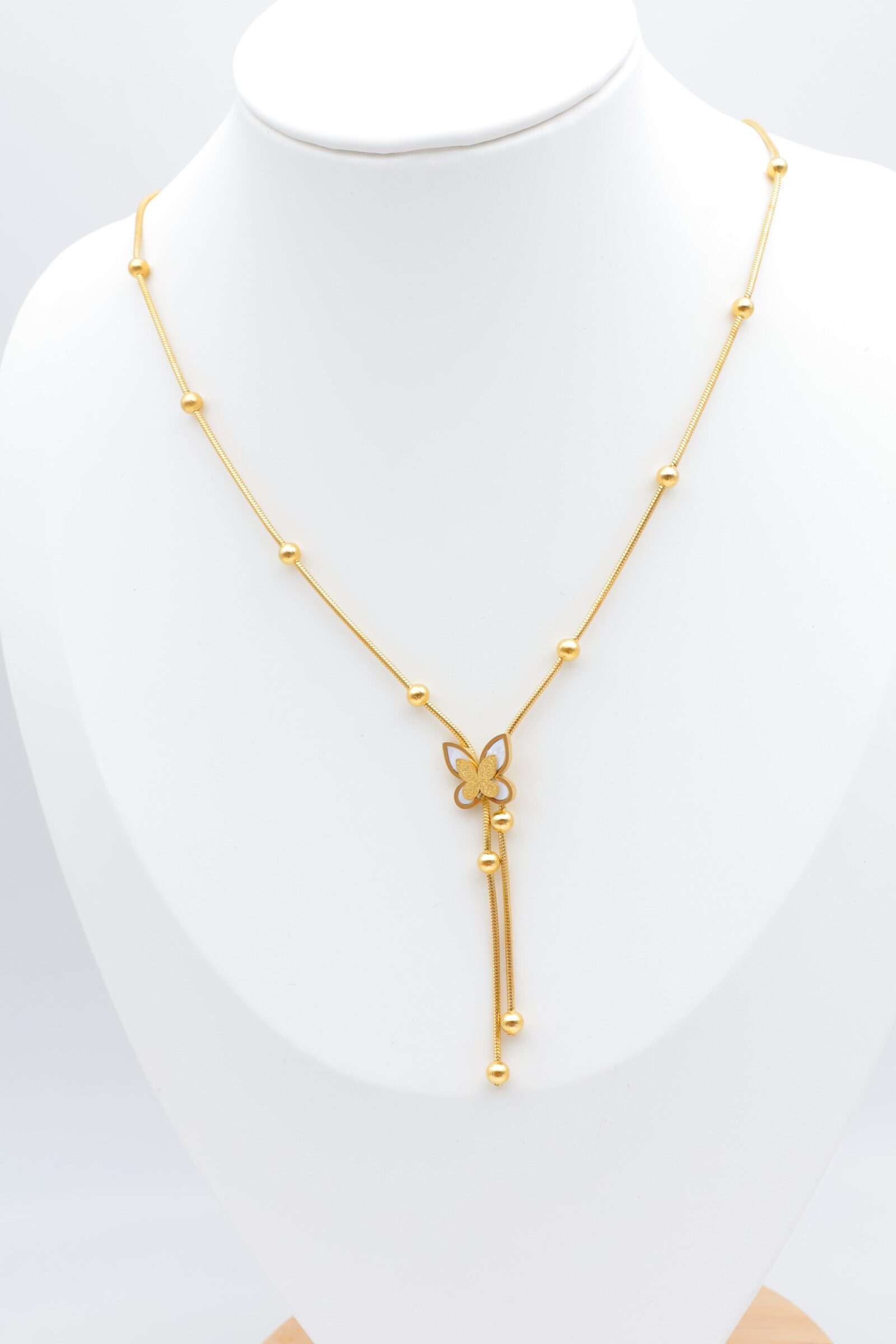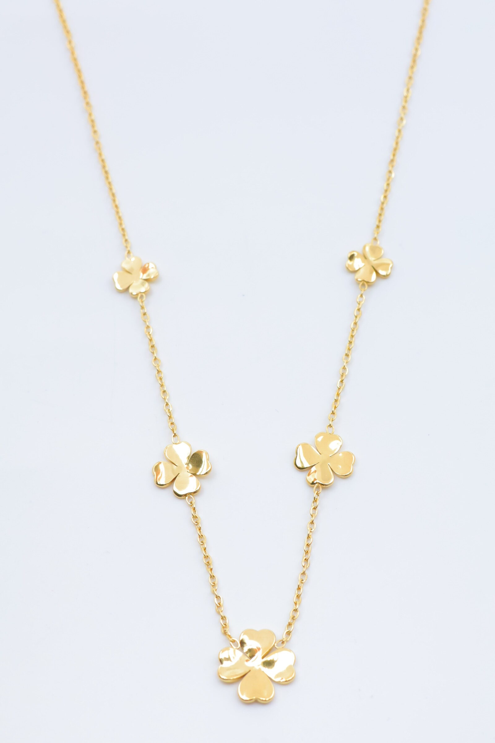 Son pendentif trèfle évoque la chance et l’élégance, suspendu à une chaîne fine ponctuée de perles dorées.